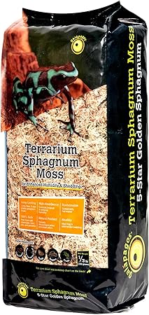 Galapagos Terrarium Sphagnum Moss, 5-star Golden Sphagnum is a soft and fluffy golden moss that holds 20 times its dry weight in moisture. It also helps fight odors, fungal growth, and mite infestation in your terrarium. It can be used as snake bedding or a moist habitat for amphibians.
